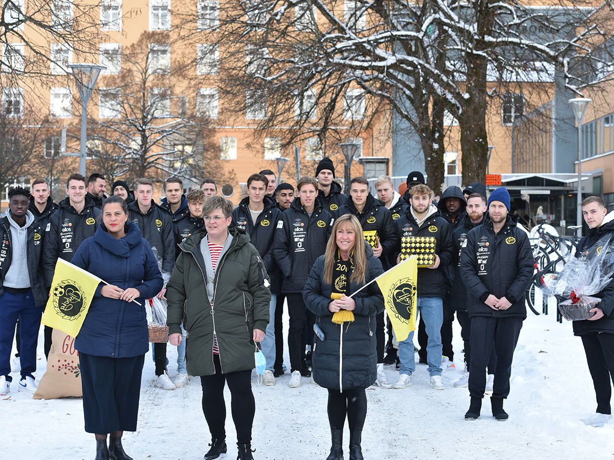 Spelarbussen med A-lagstruppen ombord rullade upp till sjukhuset runt lunchtid igår. Väl där träffade vi representanter från sjukhuset utanför byggnaden och överlämnade julklapparna till barnen.