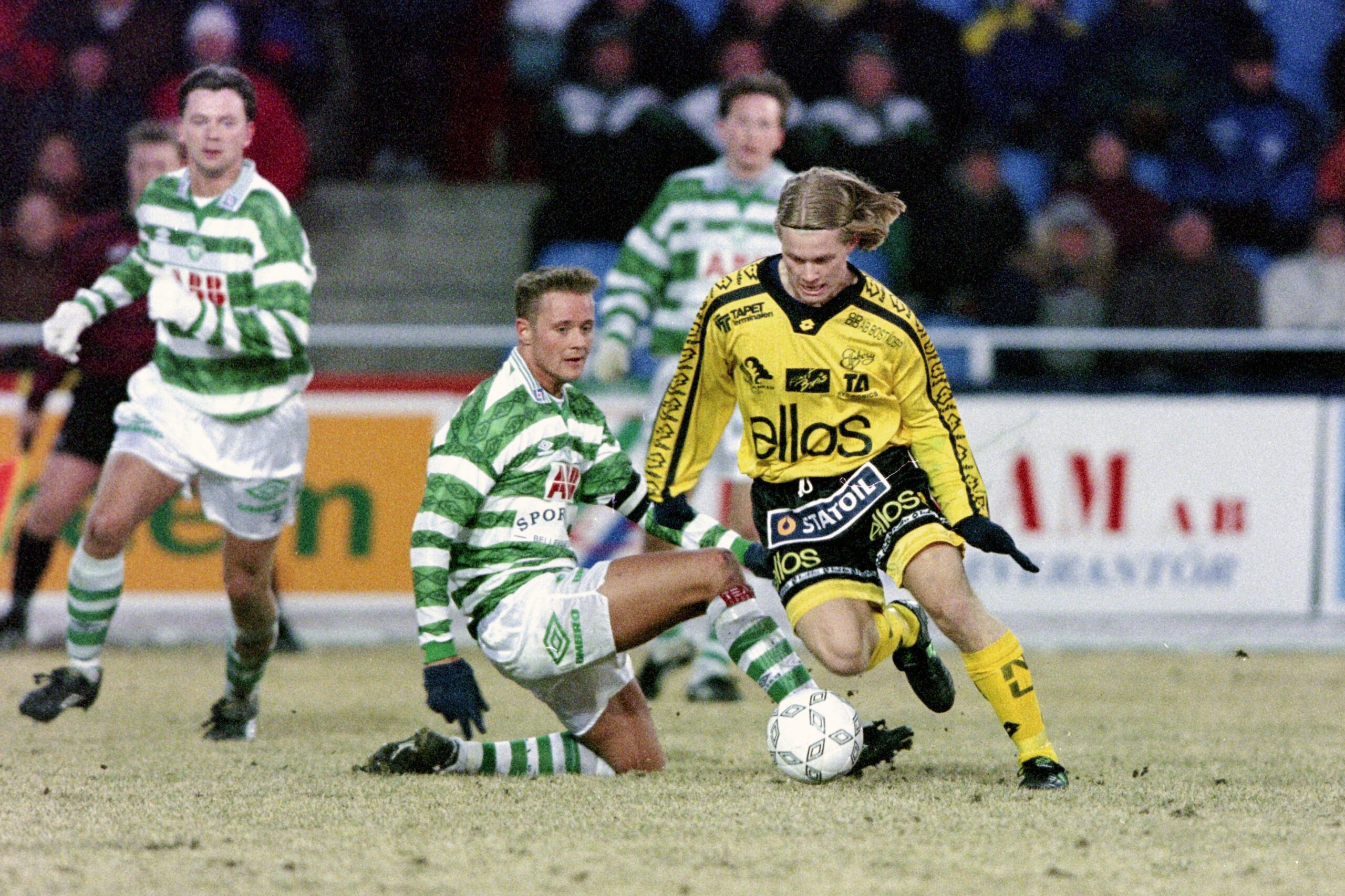 970414 Fotboll, Allsvenskan, Västerås - Elfsborg, 0-3: Tobias Linderoth, Elfsborg tar sig förbi västerås Thomas Andersson. Foto: BILDBYRÅN / 20545