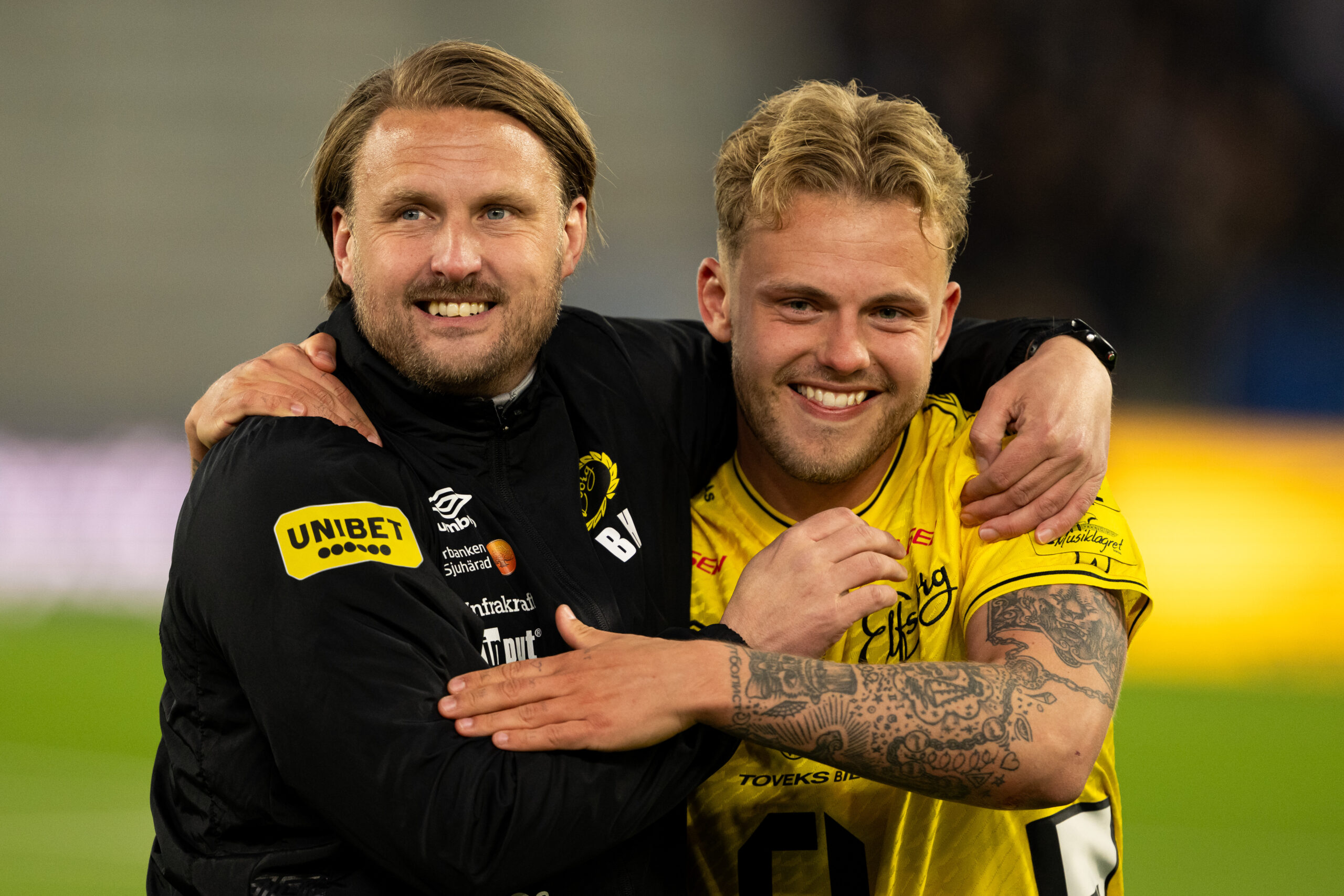 260422 Elfsborgs manager Björn Hamberg och Frederik Ihler jublar efter fotbollsmatchen i Allsvenskan mellan Elfsborg och Djurgården den 22 april 2026 i Borås. Foto: Jörgen Jarnberger / BILDBYRÅN / COP 112 / JJ0569